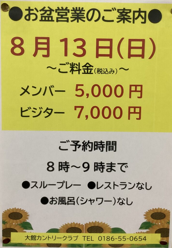お盆8/13 営業のご案内 8月13日(日) ⛳️ご予約時間 8時〜9時まで ⚫️スループレー ⚫️レストラン無し ⚫️お風呂(シャワー)無し 閉館時間 14:00 ご料金 メンバー 5,000円 ビジター 7,000円 ご来場お待ちしております🎶